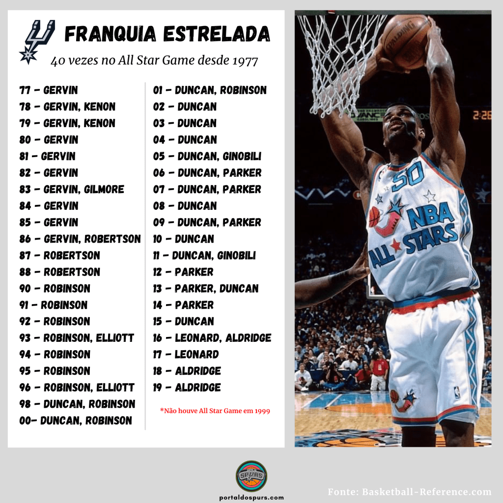 Isso mesmo. Desde que chegou à NBA, na temporada 1976/77, nenhuma outra franquia foi mais vezes representada por seus jogadores no All Star Game que o Spurs. Nem mesmo Lakers, Celtics, Bulls ou qualquer outra franquia mais glamourosa supera a de San Antonio nesse quesito.