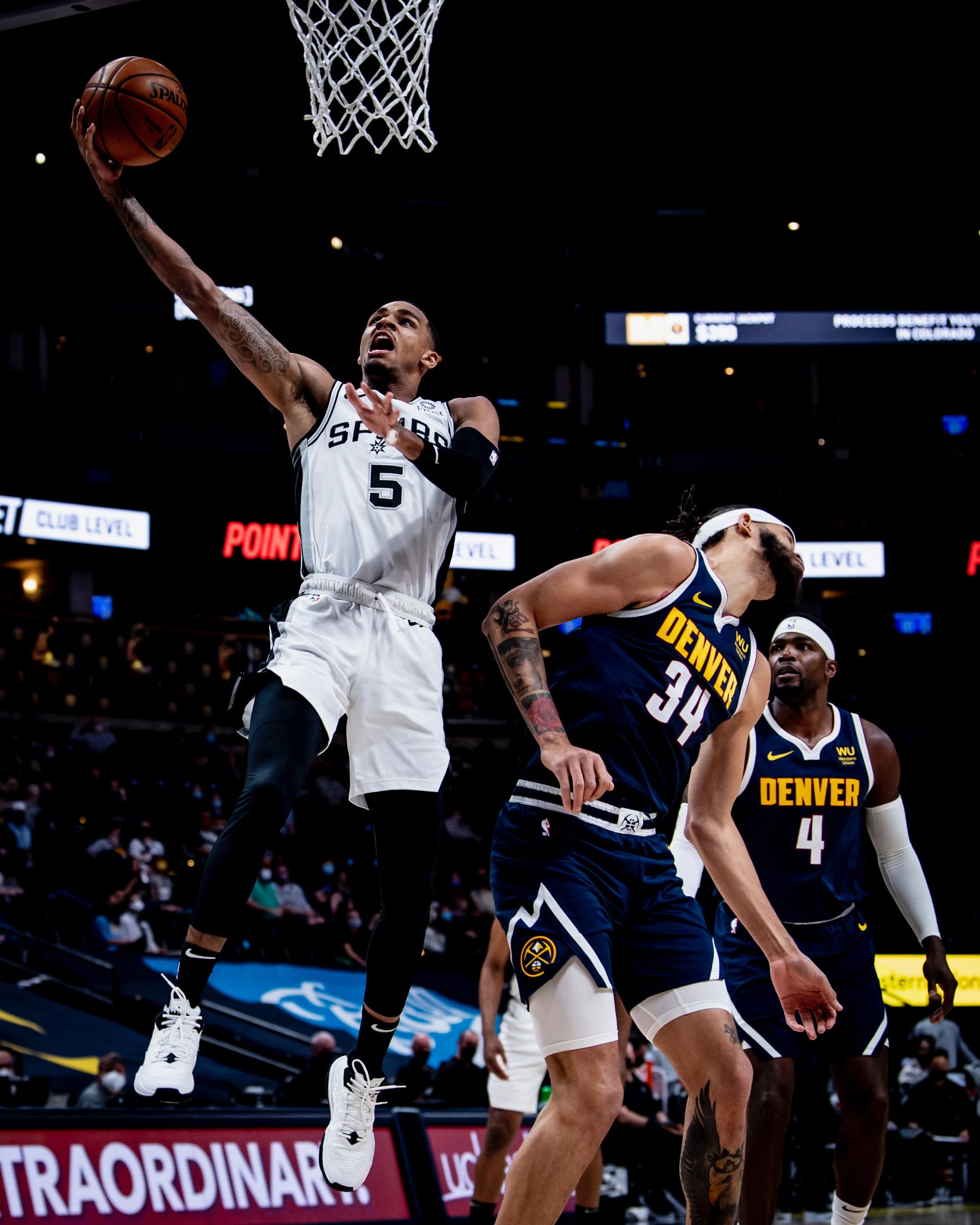 Em verdade, o Spurs não chegou a liderar em nenhum momento do jogo. Ainda no segundo quarto, inclusive, chegamos a estar perdendo 18 pontos. É que voltamos muito melhores do intervalo, quaneo tanto a defesa quanto o ataque melhoraram, de modo que nos colocamos de volta no jogo. No segundo tempo, a virada não veio muito mais por mérito do poderosíssimo ataque do Nuggets, cordenado pelo exímio passador que é Nikola Jokic, que por demérito nosso. O time batalhou até o fim, contou com um pouco de sorte nos lances livres adversários e ainda teve algumas chances de levar o jogo para a prorrogação segundos antes da sirene indicar o fim do jogo, mas acabou derrotada pela quinta vez consecutiva.