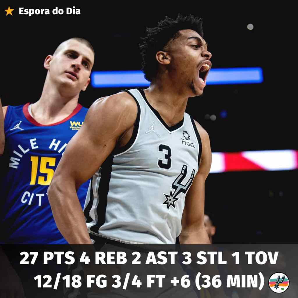 Durante a partida, a bola longa não caiu (6/22 3P) e desperdiçamos muito mais posses (20 tov) que na estreia (8). A defesa, por outro lado, foi sólida, e nos deu chance de vitória. Sob a liderança de White e Murray no perímetro e Poeltl no garrafão, o Spurs dificultou satisfatoriamente o ataque do Nuggets enquanto eles estiveram em quadra. Infelizmente, contudo, o MVP estava do outro lado, e terminou a partida com 32 pontos, 16 rebotes e 7 assistências, além de 73% de aproveitamento nos arremessos.
