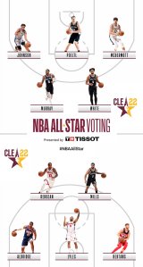 Segundo a conta do Spurs no Twitter, também é possível votar pelo @ do jogador junto à hashtag #NBAAllStar, mas seguindo o que diz o site da NBA aconselho optar pela hashtag com o nome e sobrenome do jogador, especialmente para votar em #DejounteMurray.