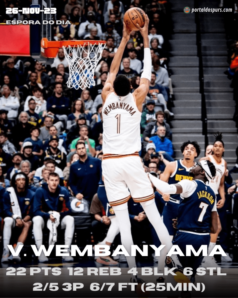 De um lado, o time texano produziu 15 turnovers, que ocasionaram 28 pontos do Nuggets. Do outro, permitiram 66 pontos no garrafão, o que ajudou Denver a terminar com incríveis 56.2% de aproveitamento e Nikola Jokic a alcançar sua maior pontuação na temporada até aqui (39), mesmo com uma boa atuação defensiva de Wembanyama, que não o marcou a todo momento, mas foi bem quando o fez, seja individualmente ou na ajuda para marcar a linha de passe.