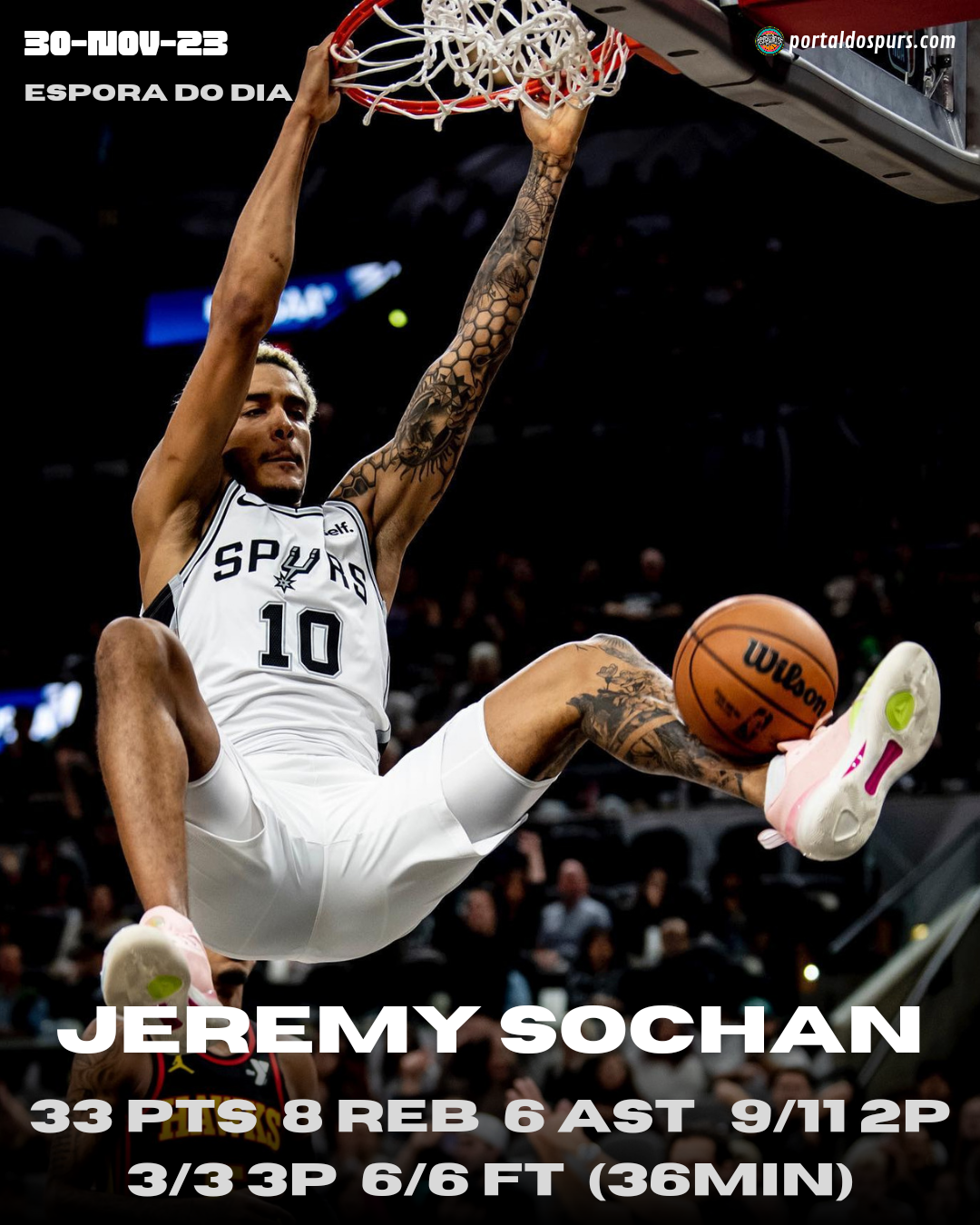 Do lado de cá, destaque para Jeremy Sochan, que fez talvez o seu melhor jogo. Ainda tem muito a crescer como armador, mas foi um pouco melhor já nessa função e ainda mais efetivo quando começou as jogadas sem a bola, seja com ou sem Tre em quadra. Fez de tudo um pouco, incluindo a maior pontuação de sua carreira (33).