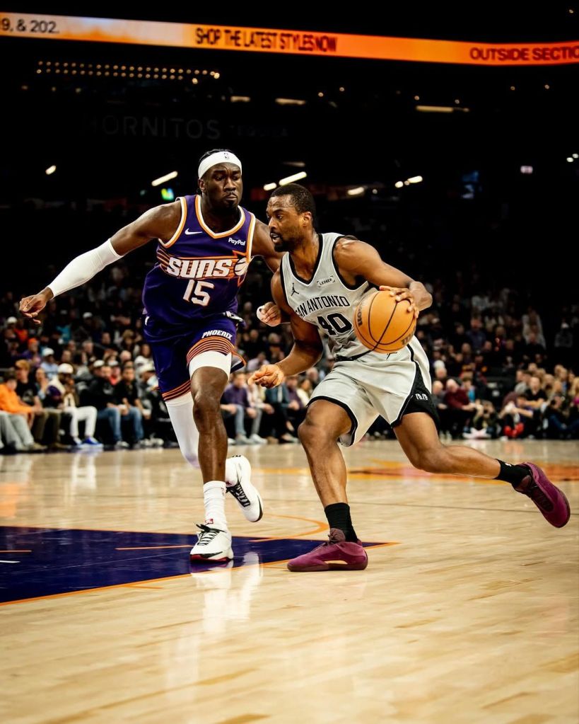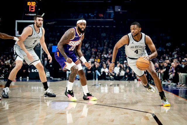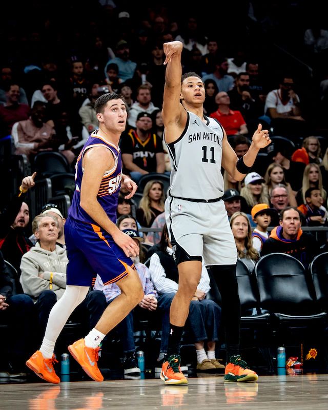 A franquia texana entrou como azarão para as casas de apostas graças aos desfalques de Wembanyama, Castle e Harper e, de fato, foi superada. Começou defendendo muito bem, mas o ataque não foi produtivo o suficiente para abrir vantagem uma confortável, de modo que no terceiro período o jogo virou – o que, infelizmente, não tem sido raro na temporada. O Suns fez 37 a 24 nesta parcial e assumiu as rédeas do jogo.