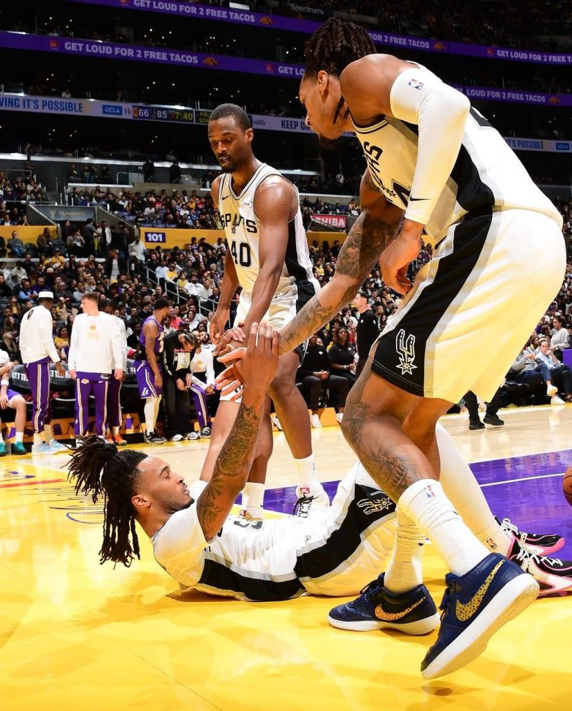 O jogo do Spurs foi baseado em transições rápidas e bem trabalhadas, que funcionaram muito bem. Foram 27 pontos de contra-ataque nessa partida, foco em pisar no garrafão e muitos e eficientes arremessos para três pontos de um ataque que já é o 6° melhor da NBA (118.6 pp/100) e só melhora desde os retornos de Harper e Castle e sob a liderança de Fox. A comissão técnica merece muitos elogios nesse quesito.