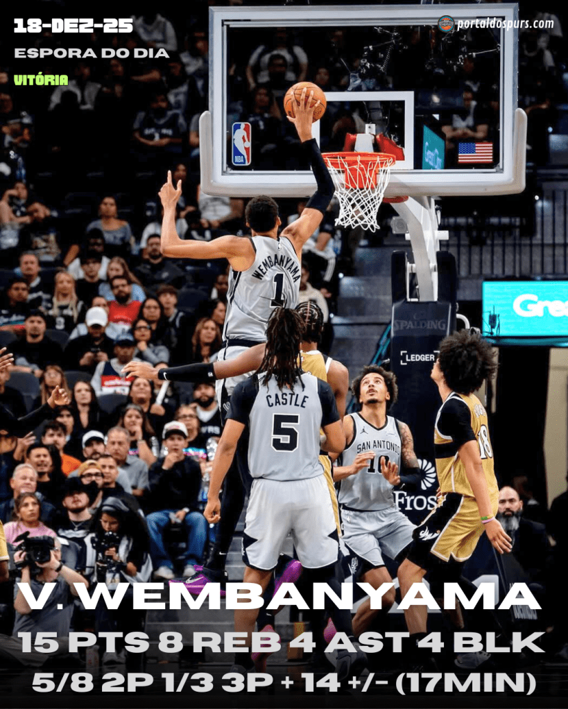 O bom segundo tempo, assim como a pontuação do banco, tem muito a ver com o fato de Victor Wembanyama estar em restrição de minutos. Ontem, ele saiu do banco e só entrou pela primeira vez em quadra durante o segundo quarto para jogar apenas 17 minutos, os quais aproveitou muito bem. Impactou o jogo nos dois lados com 15 pontos, 8 rebotes, 4 assistências e 4 tocos, além de 54% de acerto, o único da história a atingir essa marca nessa minutagem.