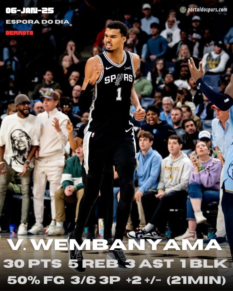 Ainda assim, por pouco o Spurs não ganhou graças à sua defesa e, principalmente, a Wembanyama. No quarto período, quando o time mais precisava, ele assumiu a responsabilidade e pontuou o suficiente para tomar a liderança por 1 ponto a 3 minutos do fim, até que voltou ao banco porque atingiu seu limite de 21 minutos em quadra. Terminou com 30 pontos, mas não pode voltar para ajudar o time a vencer.